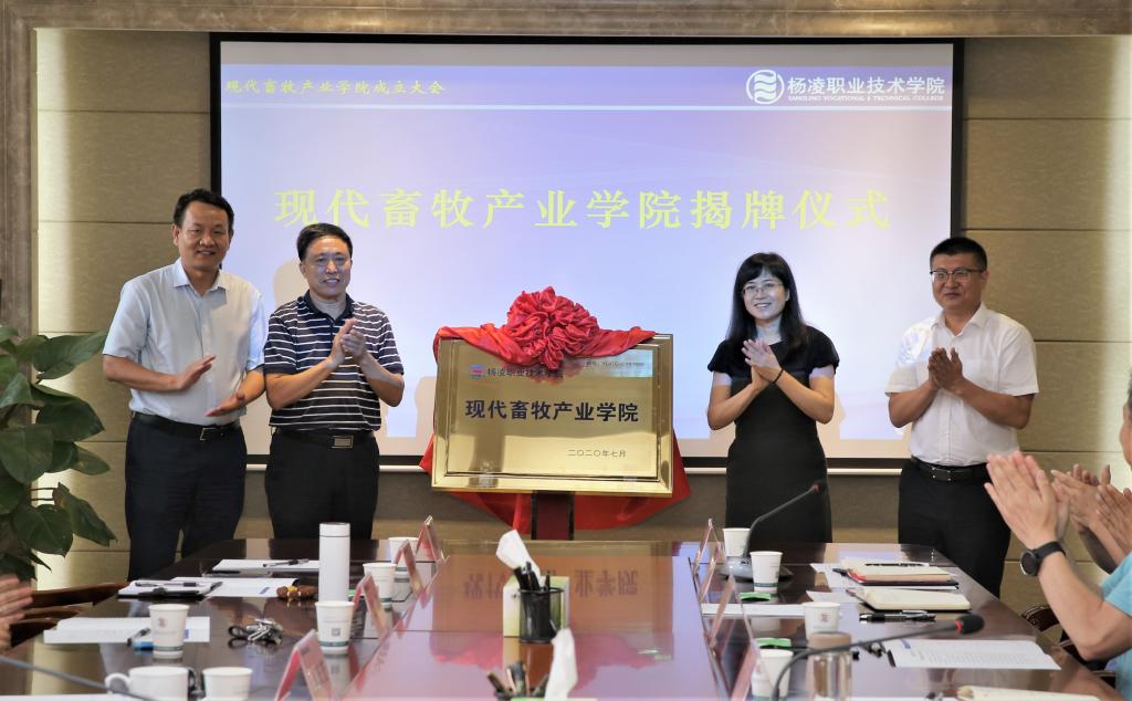 7月15日下午,杨凌职业技术学院“现代畜牧产业学院”成立暨揭牌大会在我院醒钟楼208会议室举行。学院党委书记陈宁、党委副书记任得元、副院长张迪、祝战斌,陕西省畜牧业协会常务副会长、秘书长郭庆宏、猪业分会会长、秘书长张周,陕西石羊农业科技股份有限公司总经理乔冰涛、人力资源总经理常立宏,现代牧业(集团)股份有限公司人力资源总监黎骏驹,现代牧业(宝鸡)有限公司总经理李骁勇等出席了大会。大会由副院长祝战斌主持。