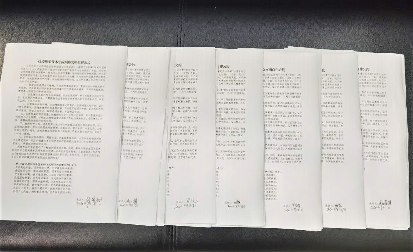 活动中,学院印发“争做中国好网民”倡议书和网络安全宣传周相关资料,利用树立宣传板、发放资料进教室、课堂、饭堂等形式,号召全院师生健康上网、文明上网、理性上网,争做中国好网民。同时,同学们以班为单位签订《杨凌职业技术学院网络文明自律公约》承诺书,共同立下庄严承诺。