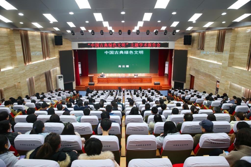 报告中,肖云儒用传统文化的视角,以渊博的学识、活跃的思维、独到的见解,从人与自然的原问题万古永存、古典绿色文化观万古长青、古典绿色生存实践万古延续、古典绿色艺术精神万代浸润等四个方面,生动地阐述了自然生态、社会生态、精神生态三层同构在良性循环中达到绿色文明的至境,以及几千年来中国古典绿色文化的主要内涵、代表人物和当下生态文明建设的意义。