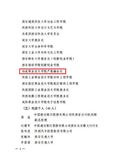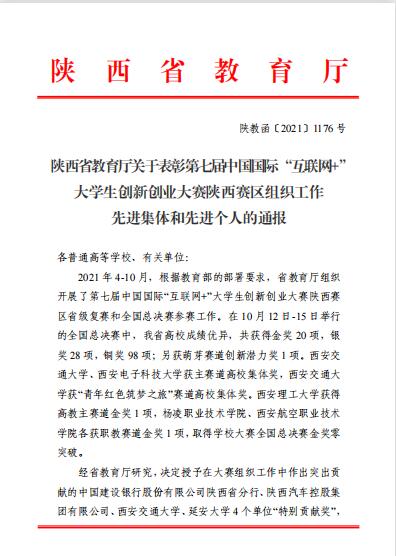 12月14日,省教育厅公布第七届中国国际“互联网+”大学生创新创业大赛陕西赛区组织工作先进集体和先进个人,学校产教融合处荣获先进集体,生物工程学院杨振华、产教融合处刘颖沙荣获先进个人。全省共有24个先进集体、48名先进工作者受到省教育厅表彰。