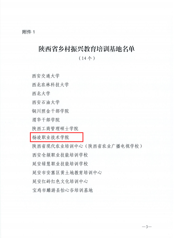 近日,中共陕西省委农村工作领导小组、省委实施乡村振兴战略领导小组办公室发布了《关于认定陕西省乡村振兴教育培训基地的通知》,杨凌职业技术学院被认定为“陕西省乡村振兴教育培训基地”。这是杨凌职院继获“陕西省乡村振兴人才培养基地”、“陕西省乡村振兴干部培训基地”之后,服务三农工作、助力推进乡村振兴全面实施的又一重要平台。