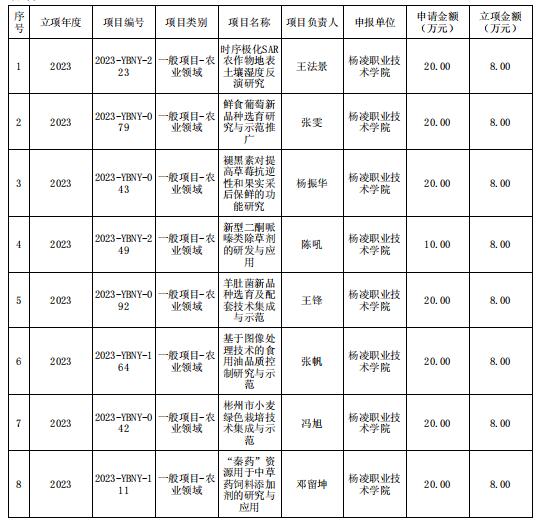 项目申报过程中,我校科教处积极动员、广泛宣传,经过项目负责人申报、科教处审核、杨凌示范区科技局推荐,共申报项目35项,最终获批12项。其中,陕西省自然科学基础研究计划面上项目和青年项目各2项,陕西省重点研发计划一般项目8项,共获批经费84万元,项目立项数与经费数均创历史新高。