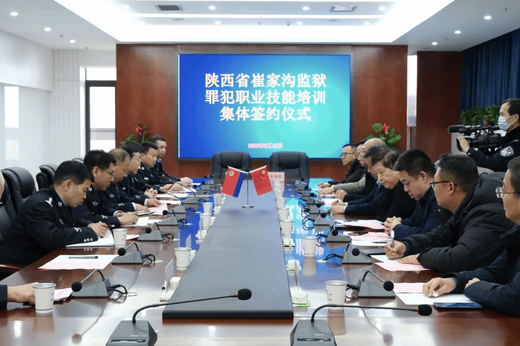 2月12日下午,学校与陕西省崔家沟监狱罪犯职业技能培训集体签约仪式在崔家沟监狱指挥大楼举行。副校长祝战斌、生物工程分院副院长杨振华、崔家沟监狱政委宋晓鹏、副政委王云峰、副监狱长张建瑞出席签约仪式。