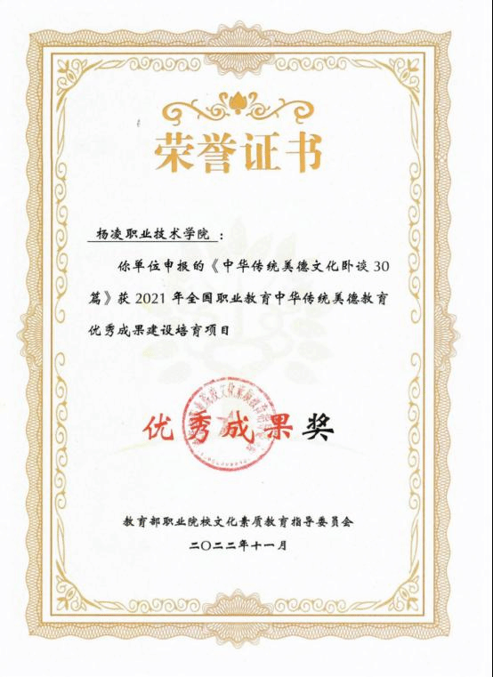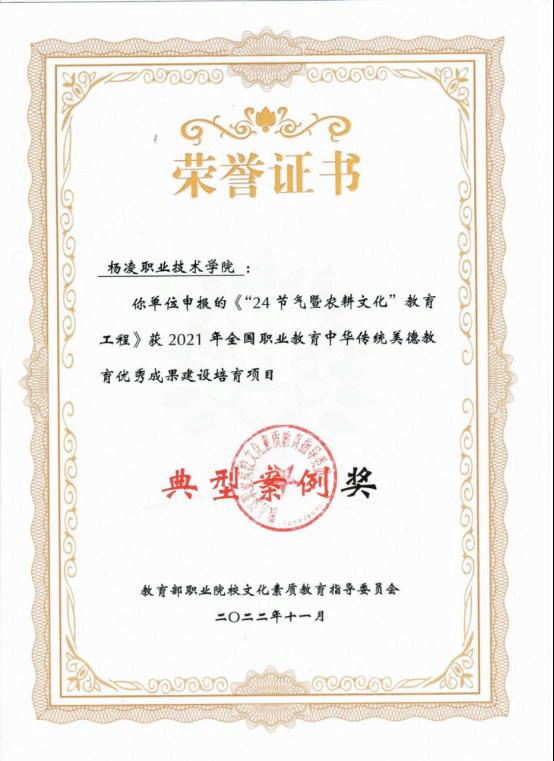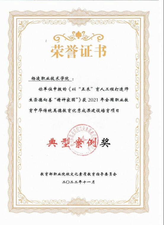 423日,教育部职业院校文化素质教育指导委员会颁发了全国职业教育中华传统美德教育优秀成果建设培育项目典型案例奖优秀案例奖和优秀成果奖证书。其中,《以“正禾育人工程打造师生崇德向善“精神家园”》“24节气暨农耕文化”教育工程》荣获典型案例奖,《“中华优秀美德文化”教育工程》荣获优秀案例奖《中华传统美德文化卧谈30篇》荣获优秀成果奖。