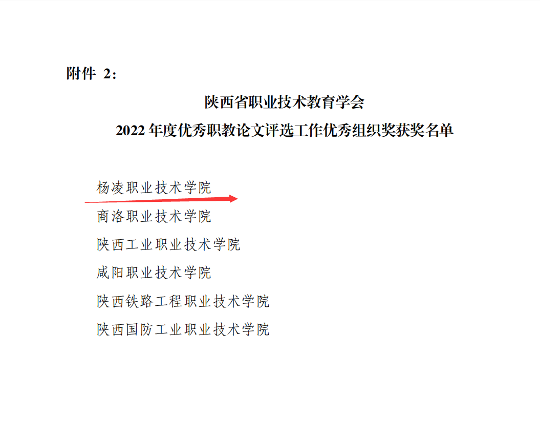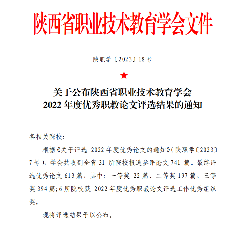 近日,陕西省职业技术教育学会公布了2022年度优秀职教论文评选结果。我校52篇论文获得陕西省职业技术教育学会优秀论文奖,其中一等奖3篇、二等奖19篇、三等奖30篇,学校荣获2022年度优秀职教论文评选工作优秀组织奖。