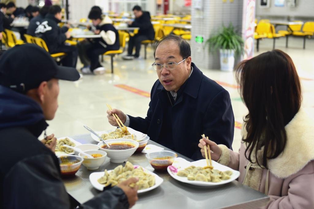 校长仲伟周与学生一起吃饺子