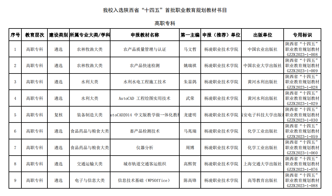 近日,省教育厅发布了陕西省“十四五”首批职业教育规划教材书目,我校18本教材入选。