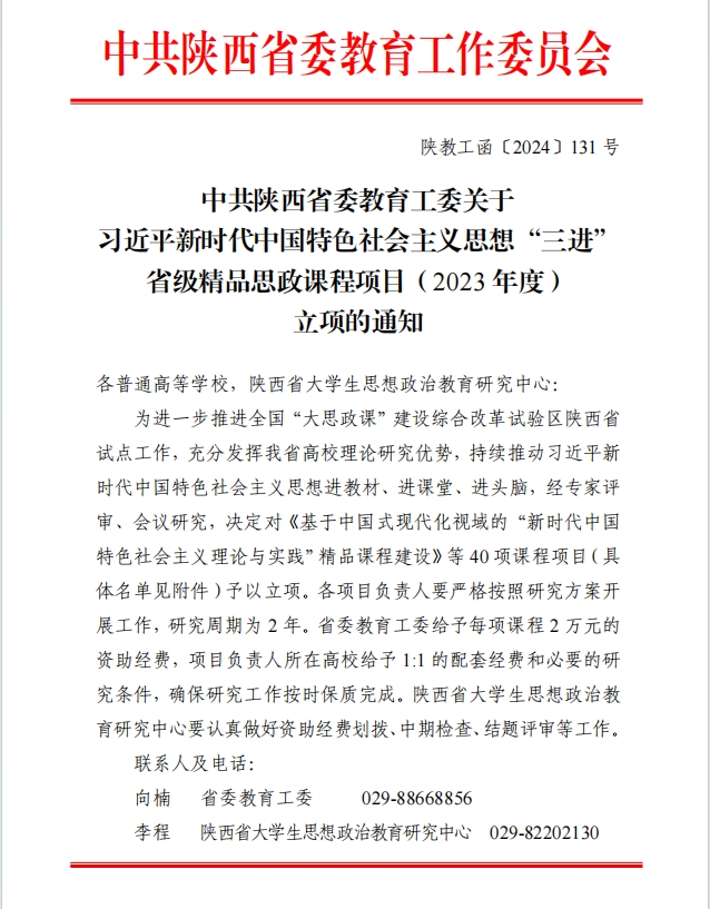 4月3日,陕西省委教育工委公布了2023年度习近平新时代中国特色社会主义思想“三进”省级精品思政课程项目立项名单,我校马克思主义学院刘晓瑞副教授主持的《“一核三链·项目支撑”教学模式赋能“概论”精品课程建设研究》获批立项。