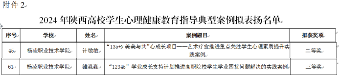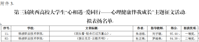 5月30日,陕西省委教育工委公布了2024年第九届陕西高校心理育人宣传季活动表扬名单,我校学生朱洁琼获第三届陕西高校大学生“心相遇 爱同行——心理健康伴我成长”主题征文活动一等奖,杜正荣获二等奖。心理教师计敏敏获陕西高校学生心理健康教育指导典型案例二等奖、雒淼淼获三等奖。
