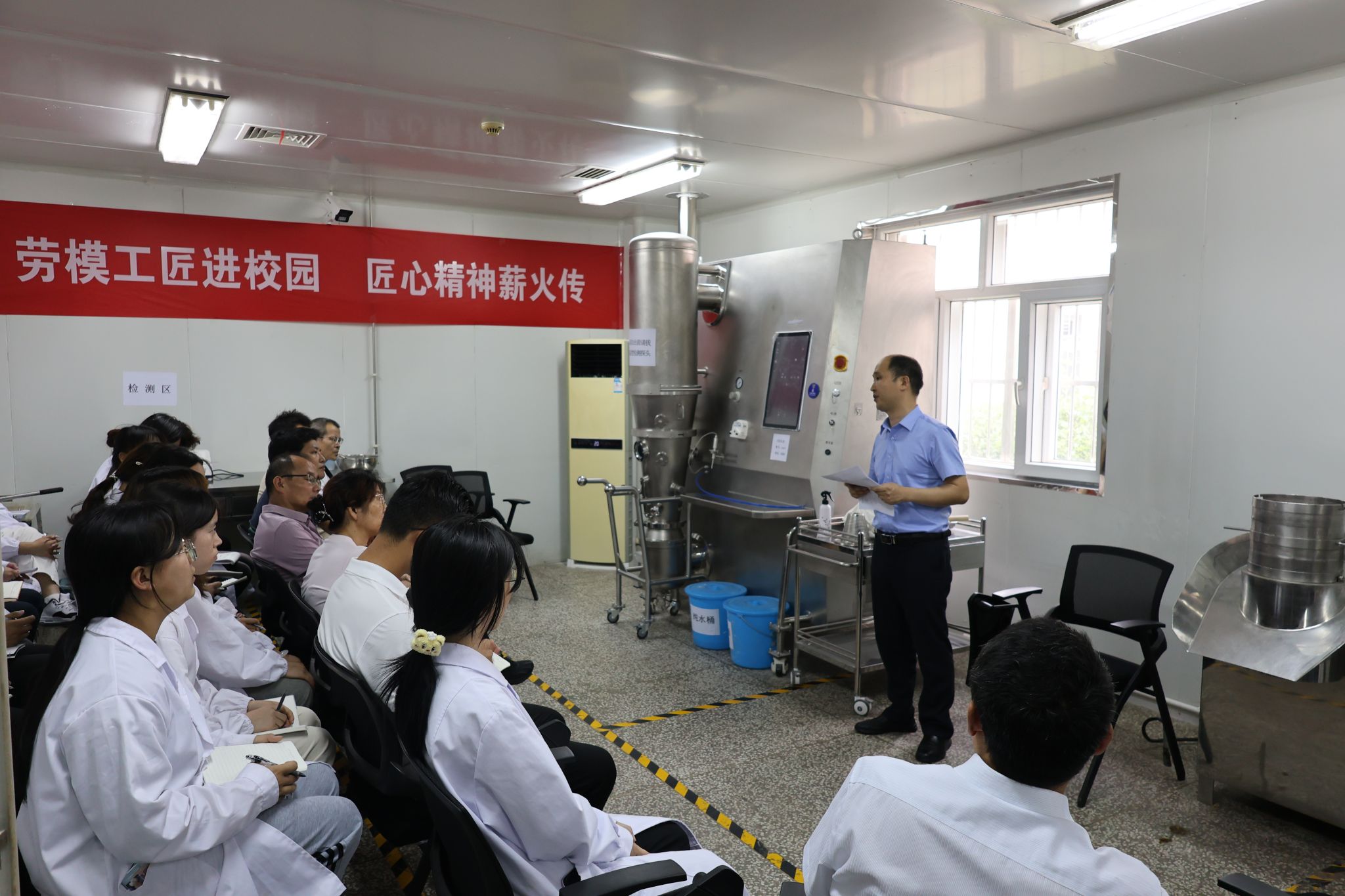 药物与化工学院实训中心,王武现场开展实训教学、仪器设备操作指导,并与在场的教师、学生展开亲切交谈,传授自己的生产操作经验,鼓励大家保持向上心态、设立成长目标,立足专业、脚踏实地。