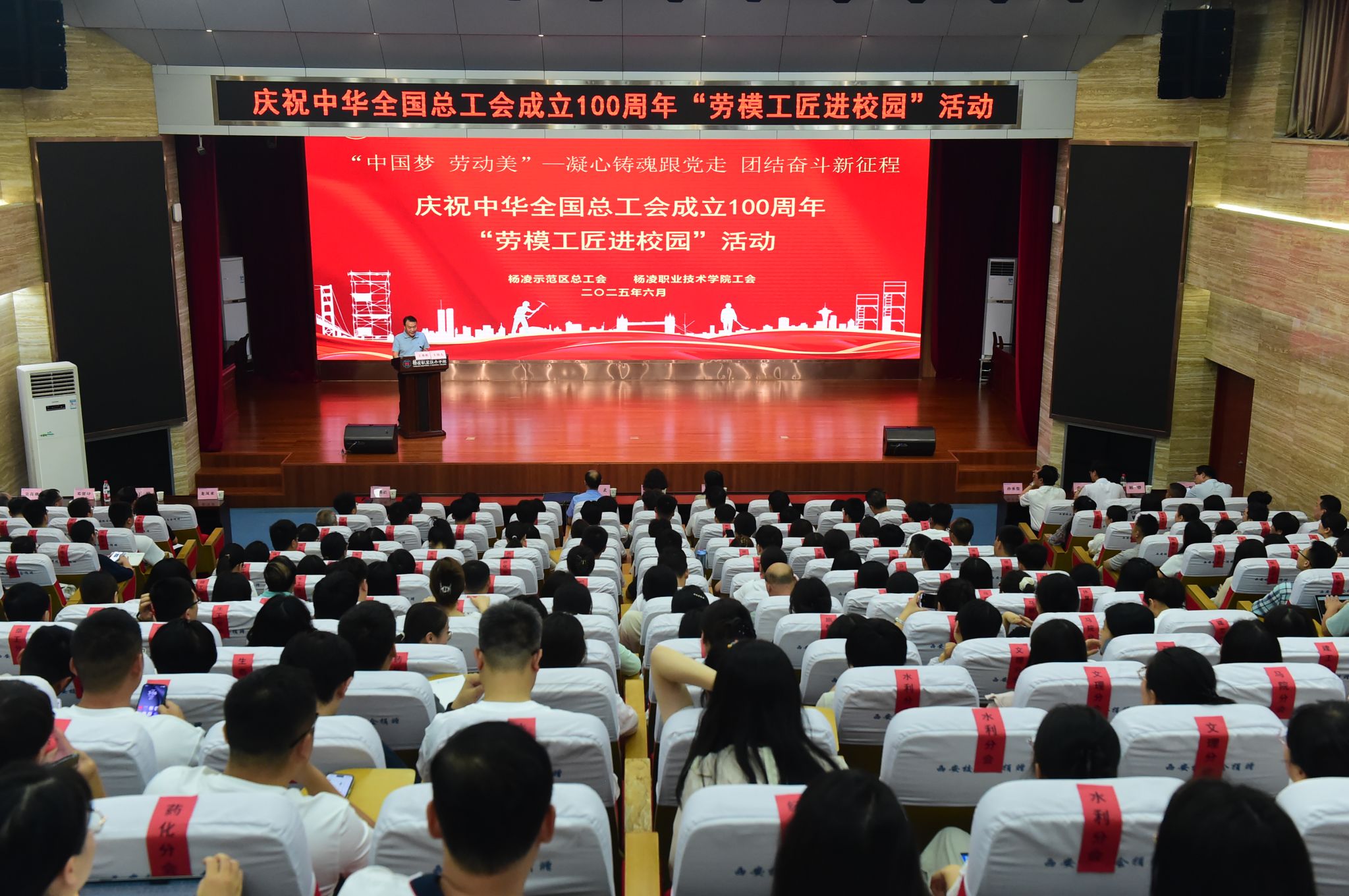 69日,由杨凌示范区总工会和学校工会共同举办中国梦 劳动美——凝心铸魂跟党走 团结奋斗新征程庆祝中华全国总工会成立100周年“劳模工匠进校园活动在我校举办活动邀请了全国先进工作者黄丽丽、全国五一劳动奖章获得者王武学校教职工作劳模精神专题报告校党委书记韩明军、校长仲伟周活动前会见了两位劳模工匠。活动由党委副书记、纪委书记王勇胜主持。400余名教职工聆听了报告。