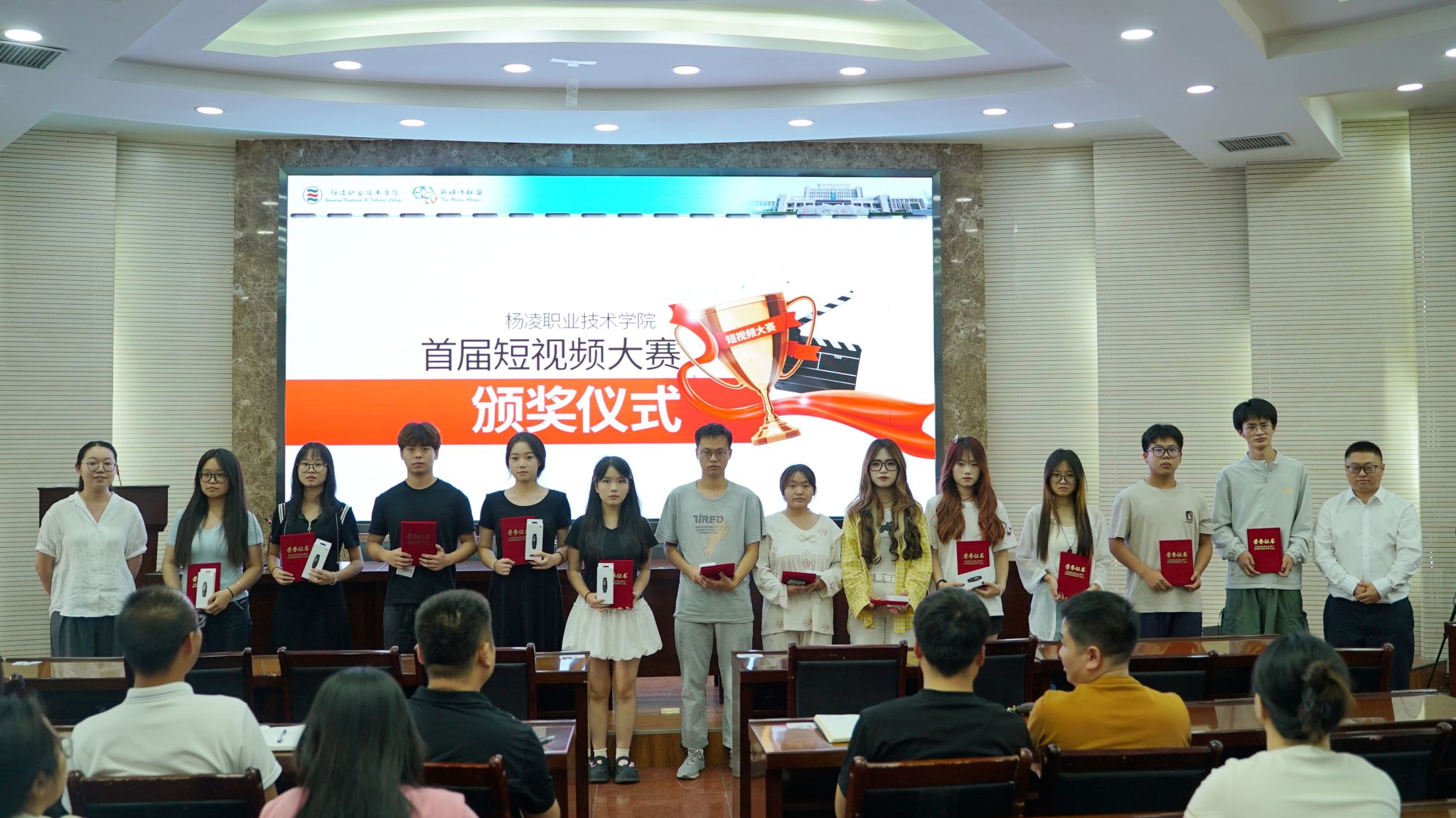 会议宣读了首届短视频大赛获奖的表彰决定。经济与贸易学院、水利工程学院学生合作的《航拍镜头下的杨职:校训是流动在建筑间的精神血脉》获一等奖,《邂逅千年的农耕文化》等 3 件作品获二等奖,《视频里的每一帧都是值得回忆的青春时光》等 10 件作品获三等奖。