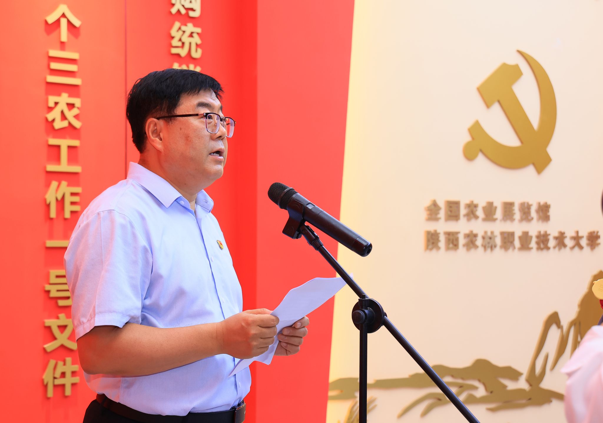 6月30日上午,百年伟业·红色三农研学馆开馆仪式在我校举行。杨凌示范区党工委书记史高领,省委农办副主任、省农业农村厅副厅长陈文,杨凌示范区党工委委员、管委会副主任张小明,西北农林科技大学党委副书记庄世宏,学校党委书记韩明军、校长仲伟周,全国农业展览馆(中国农业博物馆)当代农业研究部主任杨卫东等出席开馆仪式。开馆仪式由学校党委副书记刘瑞明主持。