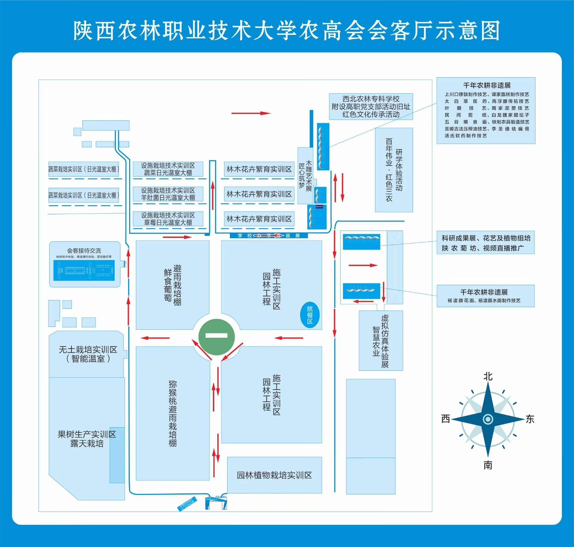 科教兴农·匠心传承主题展依据展览内容和形式的不同,划分为陕农大发展成就展、匠心筑梦木雕艺术展、千年农耕非遗展、科研成果展、现代花艺及植物组培展、陕农菊坊、智慧农业虚拟仿真体验展、现代农业成果展、咖啡制作体验、调酒调饮体验、视频直播推广等11个展区。