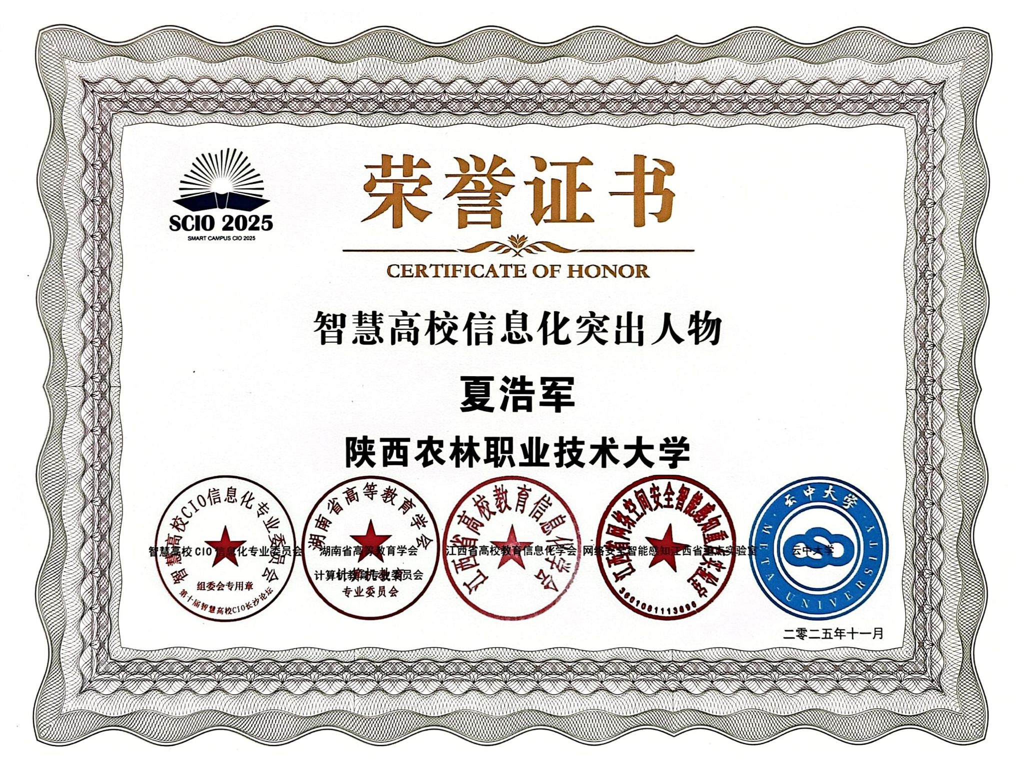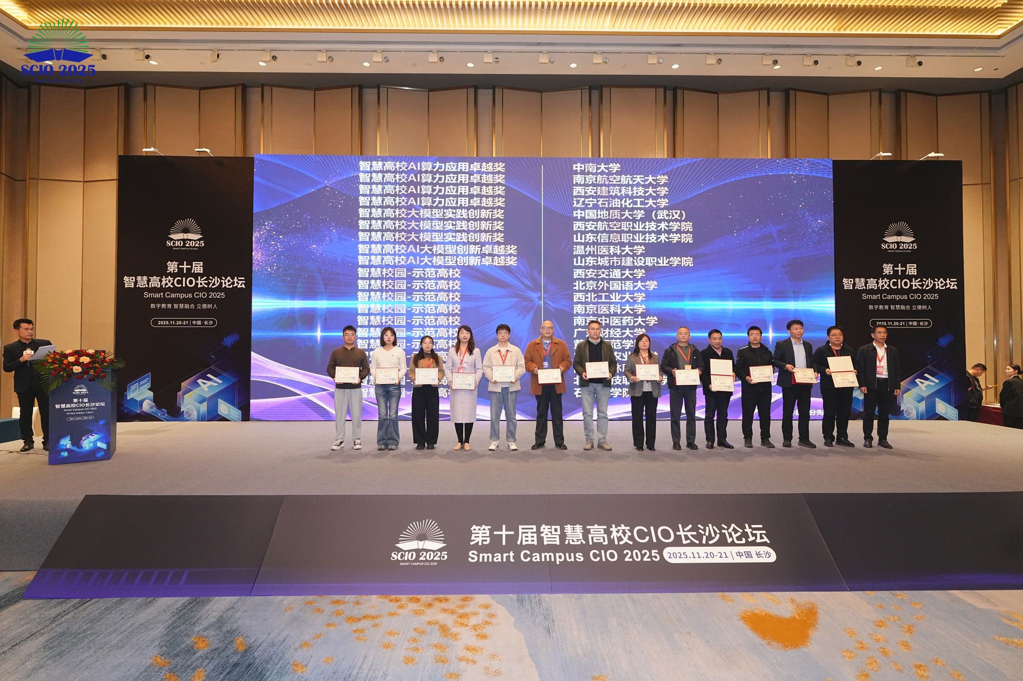 11月20日,第十届智慧高校CIO论坛在湖南长沙举办,我校凭借智慧校园建设的突出成效,斩获“智慧校园-示范高校”集体荣誉,信息化建设与管理处夏浩军、李伟分别获评“智慧高校信息化突出人物”“智慧高校信息化优秀人物”。