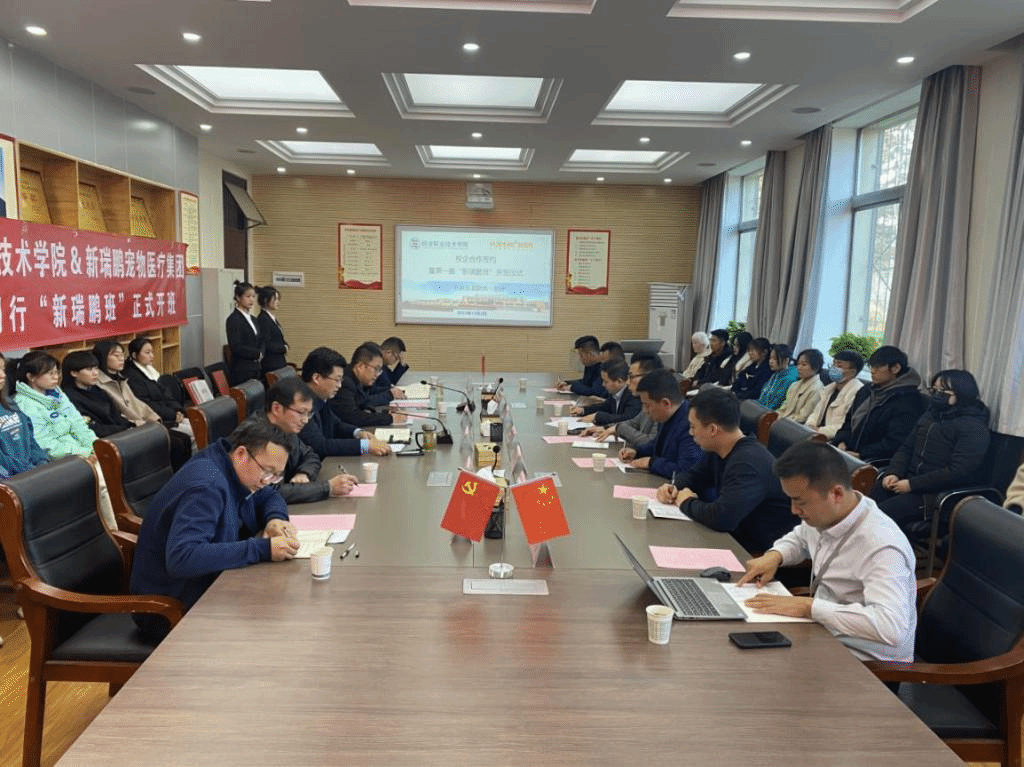 12月2日下午,学校第一届“新瑞鹏班”开班仪式在西校区林和楼131会议室举行。新瑞鹏宠物医疗集团副总裁李江、西北区副总经理刘瀛、人力资源总监刘卓,学校产教融合处副处长张英杰、动物工程学院副院长张振仓,以及第一届“新瑞鹏班”37名学生参加开班仪式。