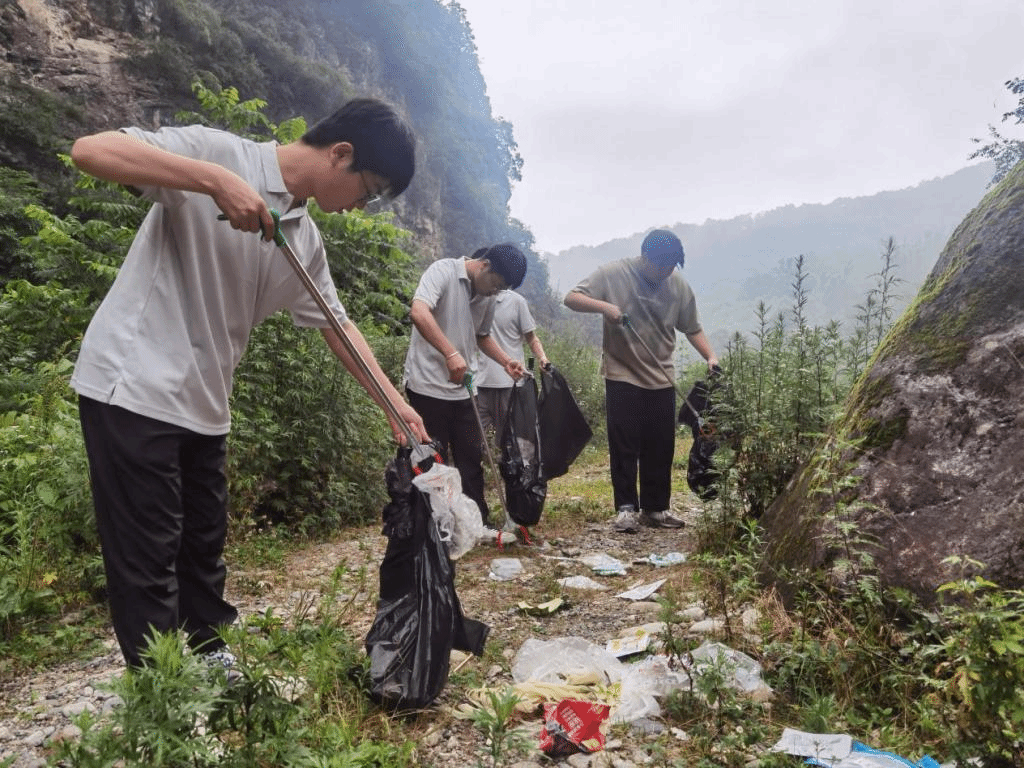 在咀头镇白云村,团队成员参观了白云村史馆、乡村振兴大讲堂,深刻领悟新时代党和国家在脱贫攻坚、乡村振兴事业发展上取得的伟大成就。随后,成员们自备工具,沿着白杨塬村太白山自然保护区后河保护站流域沿线拾级而上,捡拾路上及路旁草丛中的烟蒂、塑料纸、空瓶、果皮等十余袋。