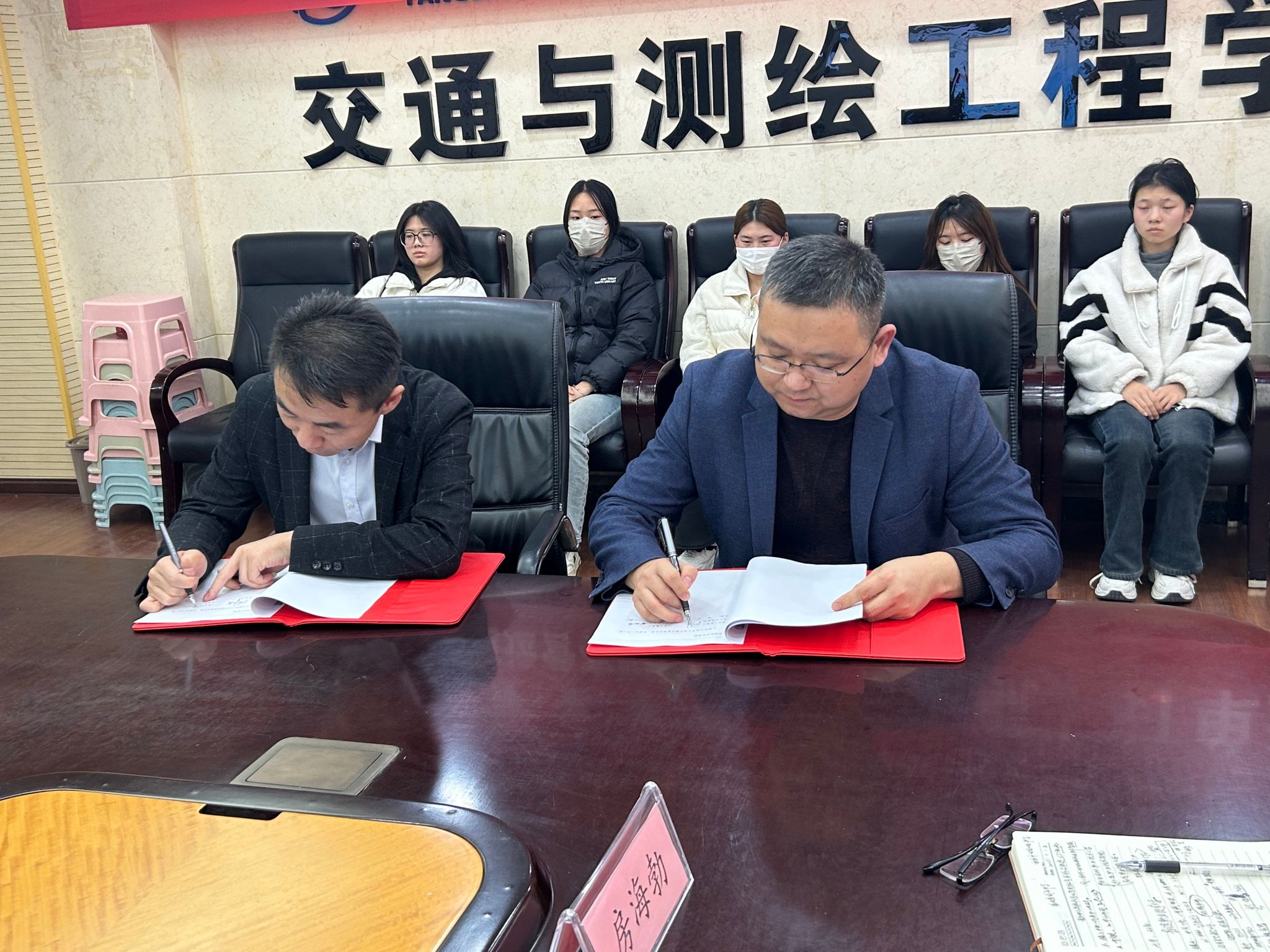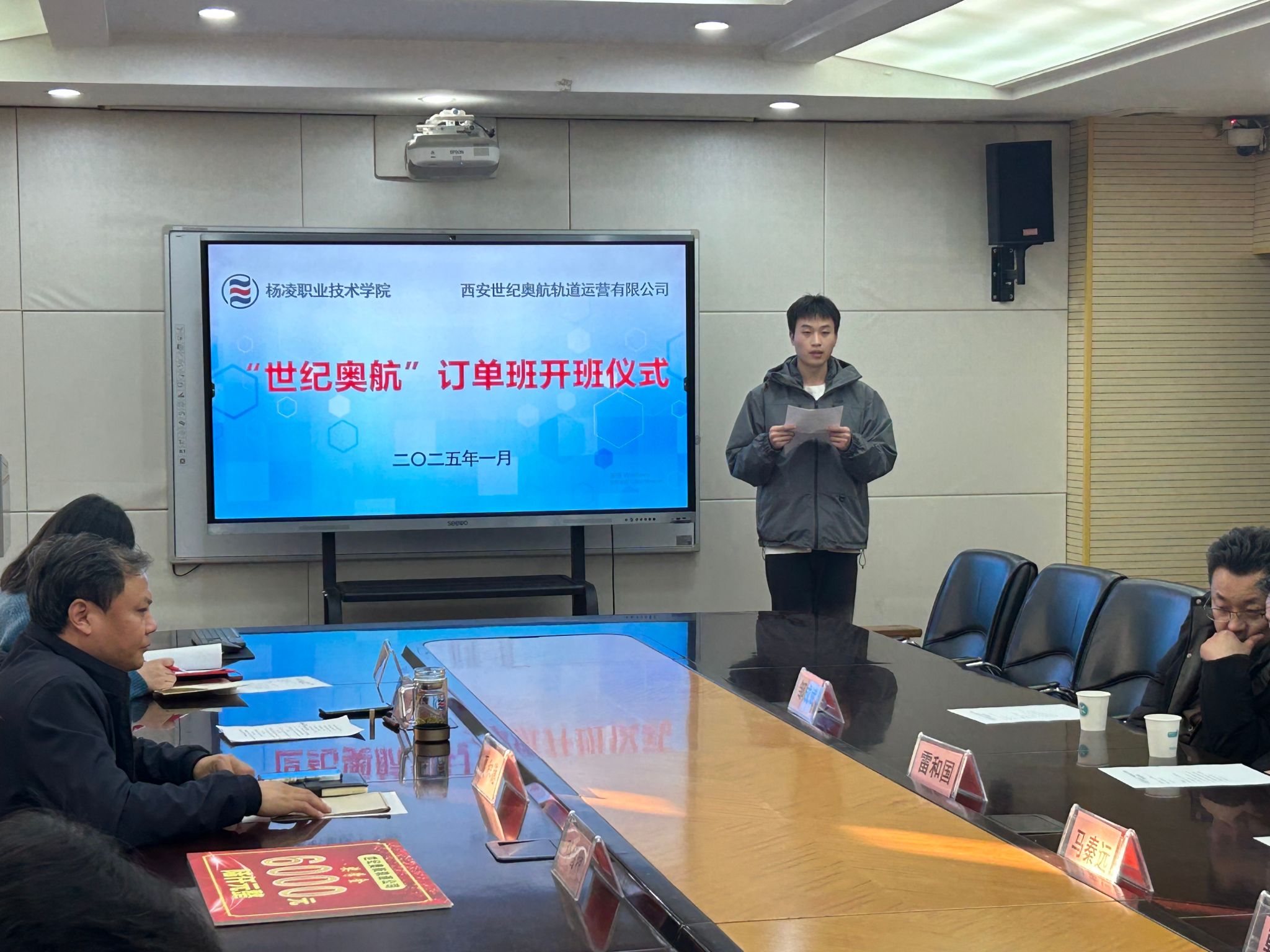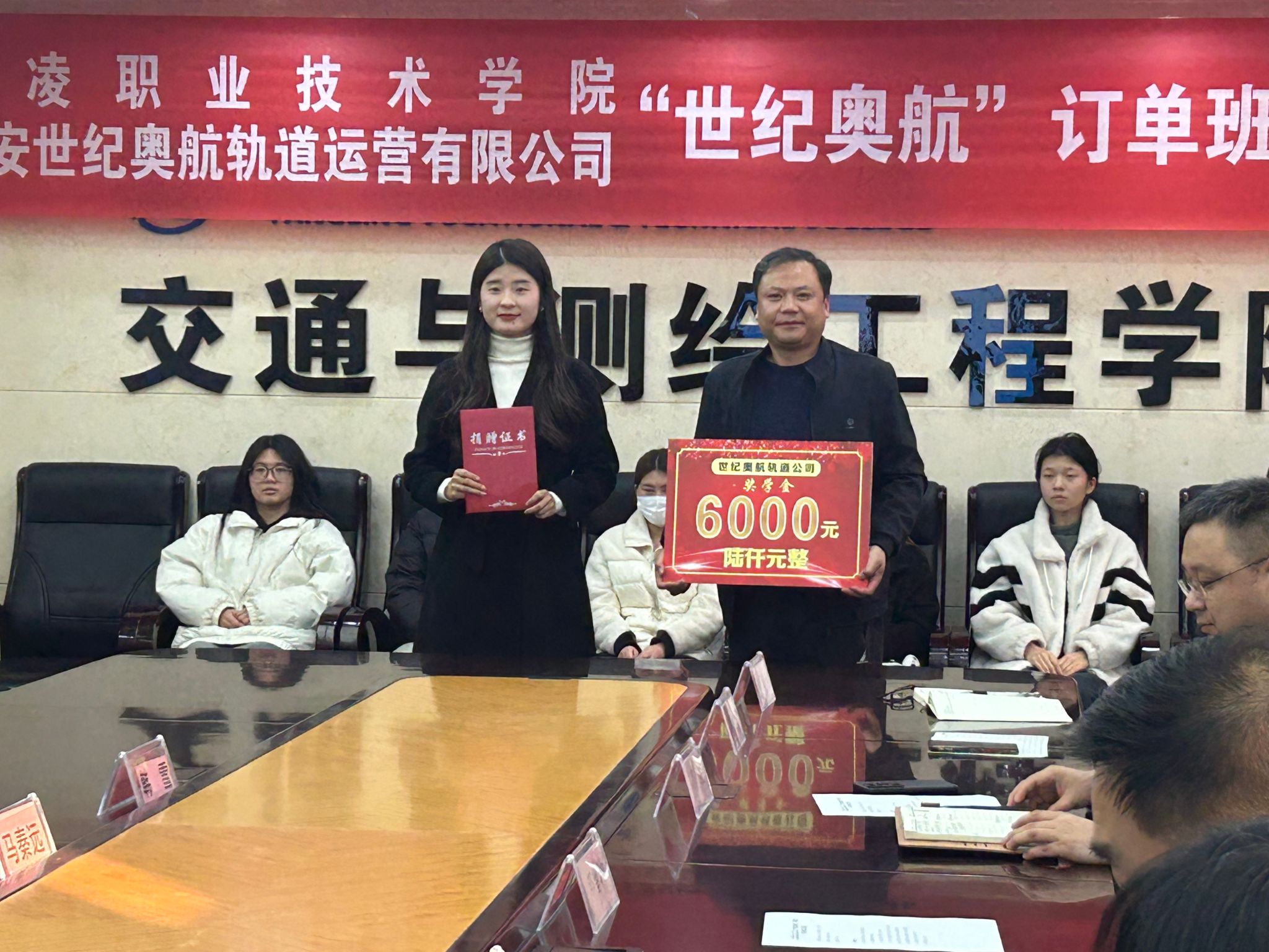 仪式上,校企双方签订了订单班合作协议,西安世纪奥航轨道运营有限公司向学院捐款6000元用于订单班奖学金发放,交通与测绘工程学院向企业颁发了捐赠证书,订单班学生进行了表态发言。