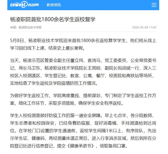 5月8日,杨凌职业技术学院迎来首批1800余名返校复学学生,他们将从线上学习回归线下上课,结束史上最长寒假。
