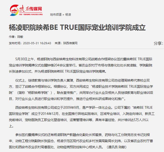 5月30日上午,杨凌职院与西安映希生物科技有限公司战略合作框架协议签约暨映希BE TRUE国际宠业培训学院揭牌仪式在醒钟楼204会议室举行。省农业农村厅市场与信息化处处长樊凌翰、学院副院长张迪参加仪式,并为杨凌职院映希BE TRUE国际宠业培训学院揭牌。