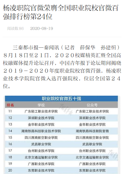 8月18日至21日,2020校媒精英汇暨全国高校融媒体提升论坛召开,中国青年报于论坛期间揭晓2019-2020年度职业院校官微百强,杨凌职业技术学院官微入选百强院校,位居全国第24位。