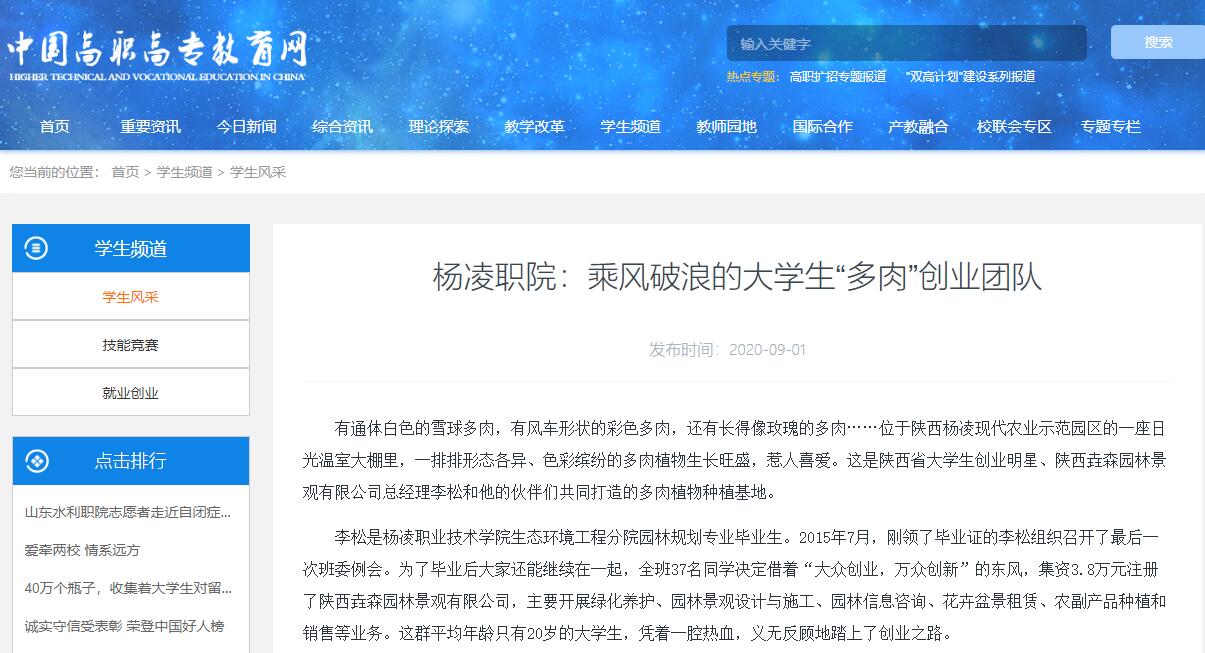 李松是杨凌职业技术学院生态环境工程分院园林规划专业毕业生。2015年7月,刚领了毕业证的李松组织召开了最后一次班委例会。为了毕业后大家还能继续在一起,全班37名同学决定借着“大众创业,万众创新”的东风,集资3.8万元注册了陕西垚森园林景观有限公司,主要开展绿化养护、园林景观设计与施工、园林信息咨询、花卉盆景租赁、农副产品种植和销售等业务。这群平均年龄只有20岁的大学生,凭着一腔热血,义无反顾地踏上了创业之路。