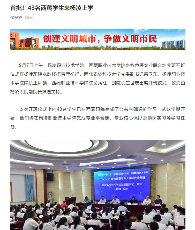 本次开班仪式上的43名学生已在西藏职院完成了公共基础课的学习,从这学期开始,他们将在杨凌职业技术学院完成专业平台课、专业核心课以及顶岗实习等学习任务。