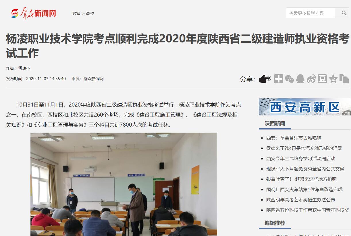 10月31日至11月1日,2020年度陕西省二级建造师执业资格考试举行,杨凌职业技术学院作为考点之一,在南校区、西校区和北校区共设260个考场,完成《建设工程施工管理》、《建设工程法规及相关知识》和《专业工程管理与实务》三个科目共计7800人次的考试任务。
