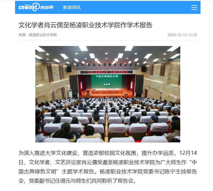 为深入推进大学文化建设,营造浓郁校园文化氛围,提升办学品质,12月14日,文化学者、文艺评论家肖云儒受邀至杨凌职业技术学院为广大师生作“中国古典绿色文明”主题学术报告。杨凌职业技术学院党委书记陈宁主持报告会,党委副书记任得元与师生们共同聆听了报告会。