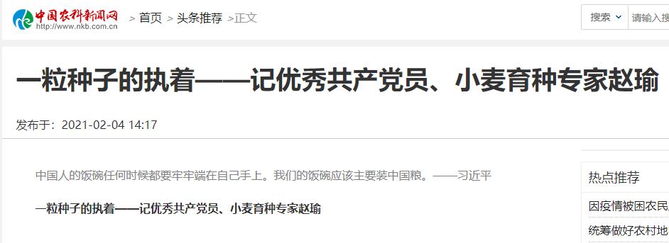 【中国农科新闻网】一粒种子的执着——记优秀共产党员、小麦育种专家赵瑜