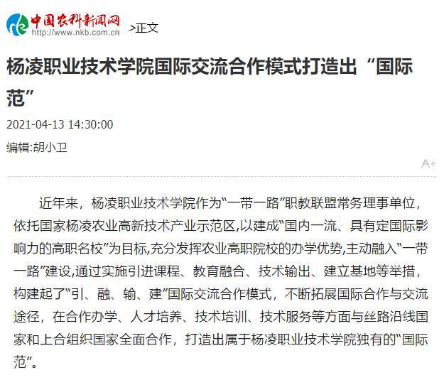 近年来,杨凌职业技术学院作为“一带一路”职教联盟常务理事单位,依托国家杨凌农业高新技术产业示范区,以建成“国内一流、具有定国际影响力的高职名校”为目标,充分发挥农业高职院校的办学优势,主动融入“一带一路”建设,通过实施引进课程、教育融合、技术输出、建立基地等举措,构建起了“引、融、输、建”国际交流合作模式,不断拓展国际合作与交流途径,在合作办学、人才培养、技术培训、技术服务等方面与丝路沿线国家和上合组织国家全面合作,打造出属于杨凌职业技术学院独有的“国际范”。