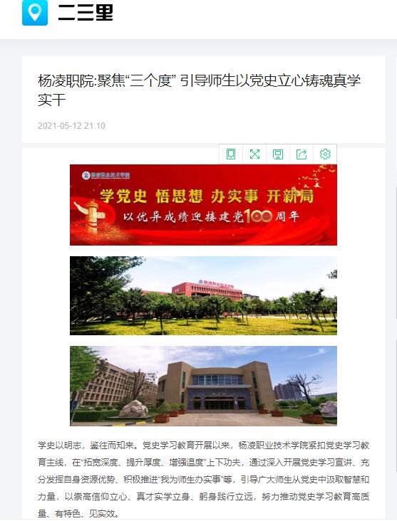 学史以明志,鉴往而知来。党史学习教育开展以来,杨凌职业技术学院紧扣党史学习教育主线,在“拓宽深度、提升厚度、增强温度”上下功夫,通过深入开展党史学习宣讲、充分发挥自身资源优势、积极推进“我为师生办实事”等,引导广大师生从党史中汲取智慧和力量,以崇高信仰立心、真才实学立身、躬身践行立远,努力推动党史学习教育高质量、有特色、见实效。