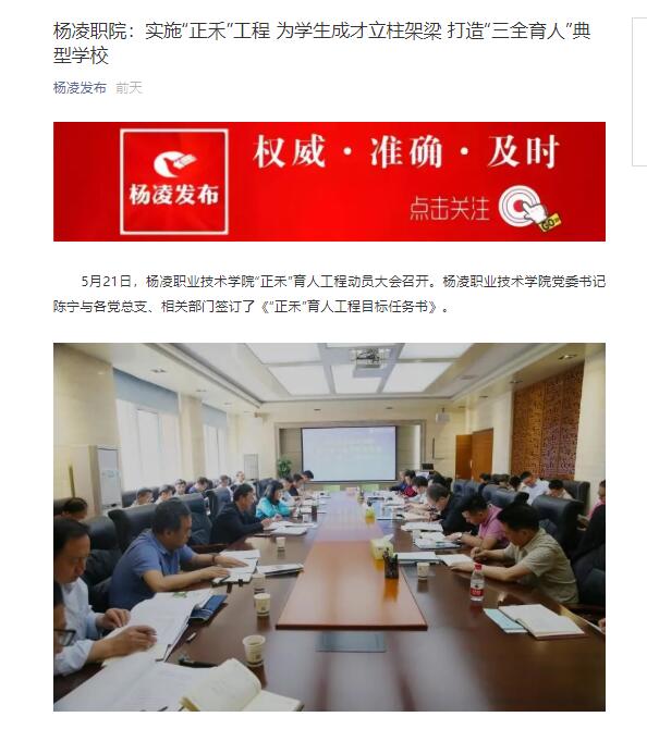 5月21日,杨凌职业技术学院“正禾”育人工程动员大会召开。杨凌职业技术学院党委书记陈宁与各党总支、相关部门签订了《“正禾”育人工程目标任务书》。