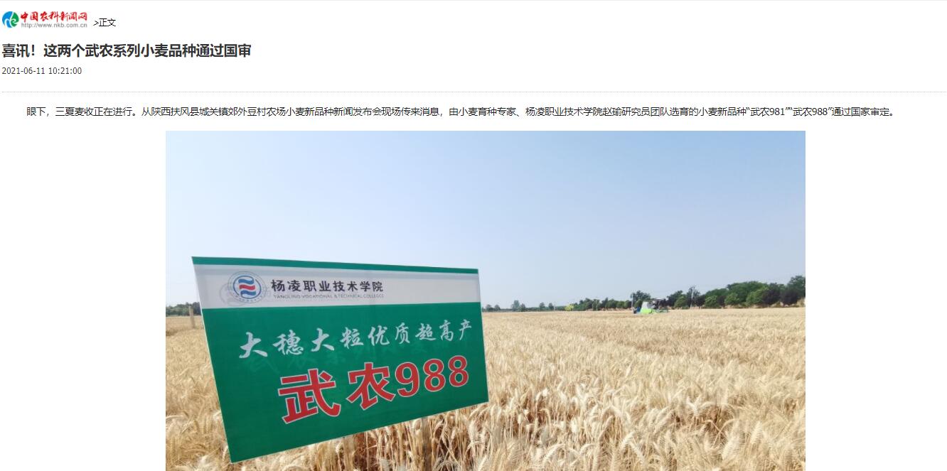 6月9日,中华人民共和国农业农村部公告第432号—2021年小麦品种审定公告,“武农981”“武农988”等154个小麦品种业经第四届国家农作物品种审定委员会第四次会议审定通过。