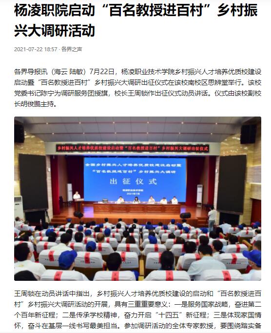 “百名教授进百村”活动是杨凌职院依托学校省级科技特派员、产业体系专家、“博士+高职生工作室” 、“教授+科研推广工作室”、产学研示范基地、精准扶贫结对帮扶点等载体,在全校遴选了300 名思想素质好、理论水平高、实践经验丰和责任心强的专家教授,组成110个服务团,自即日起至8月31日,深入陕西省12个市(区)的100个县村,根据当地产业发展需要开展的一项“支农助农”活动。该活动融党史宣讲、政策解读、社会服务、技术指导为一体,通过开展党史宣传讲座、专题化“百村论坛”、现代农业技术推广、乡村治理咨询及乡村发展现状研究等活动,搭建服务“乡村振兴”数据库和长期观察点,形成乡村振兴系列资政调研报告,为产业发展、生态文明、美丽乡村提供智力支持,为地方政府乡村治理机制创新和农村发展搭建平台。