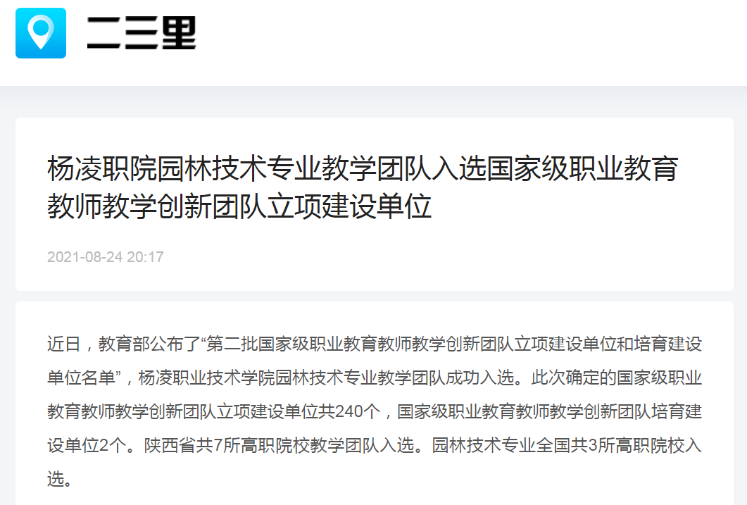 【二三里】杨凌职院园林技术专业教学团队入选国家级职业教育教师教学创新团队立项建设单位