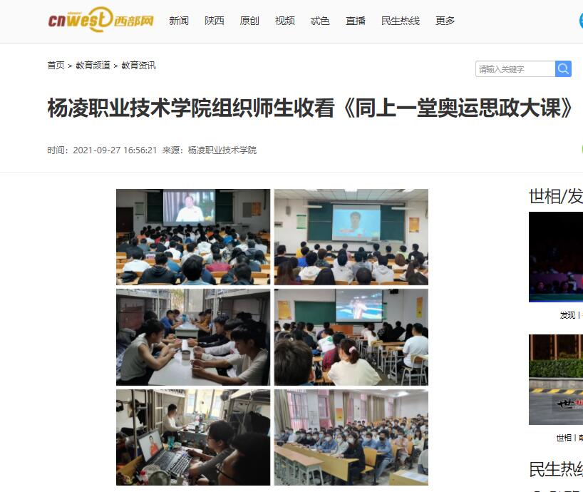9月25日下午,全国大学生“同上一堂奥运思政大课”线上开播。杨凌职业技术学院组织全校师生利用手机、电脑、多媒体教室等方式,通过人民网+客户端、人民网微信公众号、咪咕视频客户端等平台齐聚直播间,共同观看奥运思政大课。