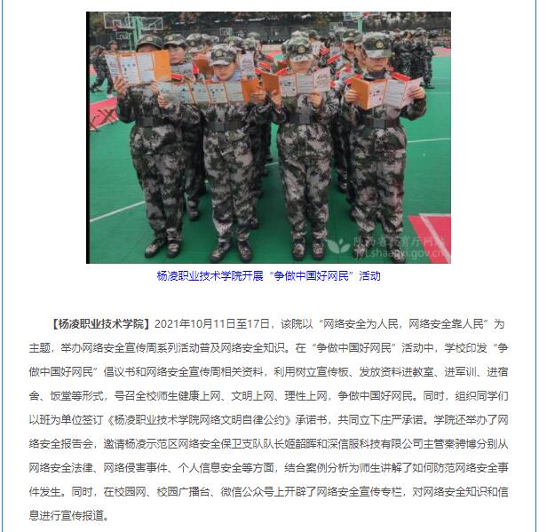 【杨凌职业技术学院】2021年10月11日至17日,该院以“网络安全为人民,网络安全靠人民”为主题,举办网络安全宣传周系列活动普及网络安全知识。在“争做中国好网民”活动中,学校印发“争做中国好网民”倡议书和网络安全宣传周相关资料,利用树立宣传板、发放资料进教室、进军训、进宿舍、饭堂等形式,号召全校师生健康上网、文明上网、理性上网,争做中国好网民。同时,组织同学们以班为单位签订《杨凌职业技术学院网络文明自律公约》承诺书,共同立下庄严承诺。学院还举办了网络安全报告会,邀请杨凌示范区网络安全保卫支队队长姬韶晖和深信服科技有限公司主管秦骋博分别从网络安全法律、网络侵害事件、个人信息安全等方面,结合案例分析为师生讲解了如何防范网络安全事件发生。同时,在校园网、校园广播台、微信公众号上开辟了网络安全宣传专栏,对网络安全知识和信息进行宣传报道。