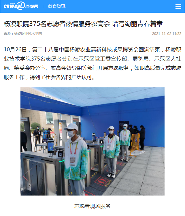 10月26日,第二十八届中国杨凌农业高新科技成果博览会圆满结束,杨凌职业技术学院375名志愿者分别在示范区党工委宣传部、展览局、示范区人社局、筹委会办公室、农高会督导组等部门开展志愿服务,如期高质量完成志愿服务工作,得到了社会各界的广泛认可。
