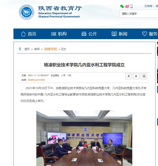 2021年10月30日下午,由杨凌职业技术学院与几内亚科纳克里大学、几内亚科纳克里大学孔子学院共同合作的中国-几内亚水利工程专业教育合作项目(杨凌职业技术学院几内亚水利工程学院)协议签约仪式在线上举行。
