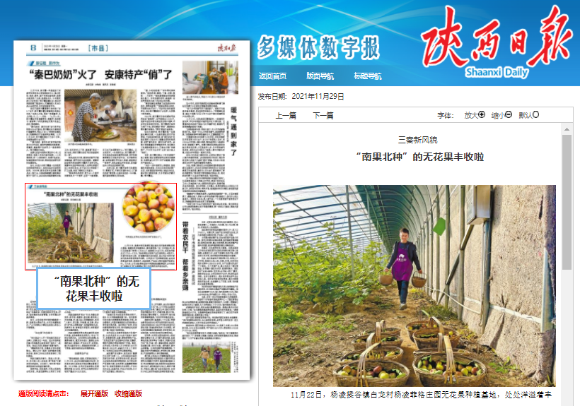 11月22日,杨凌示范区杨陵区揉谷镇白龙村杨凌菲格庄园大棚里,饱满的果实挂满枝头,散发着甜香。“自7月开园以来,我们已经销售了鲜果10万余公斤,销售额300多万元,每亩地年效益达3万元—5万元。”杨凌菲格无花果产业发展有限公司技术人员穆文刚告诉记者。好销量和高收益的背后,是公司多年来不断进行的品种培育和技术创新。公司成立了无花果研究院,在无花果新品种选育、栽培技术、采后保鲜、产品加工等方面展开科研工作。不久前,公司与杨凌职业技术学院钱拴提教授团队合作选育的“丝路红玉”和“丝路黄金”两个无花果新品种通过省审。