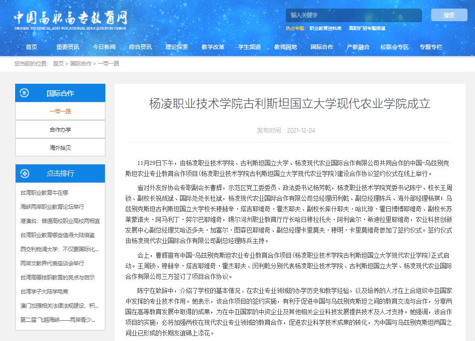 11月29日下午,由杨凌职业技术学院、古利斯坦国立大学、杨凌现代农业国际合作有限公司共同合作的中国-乌兹别克斯坦农业专业教育合作项目(杨凌职业技术学院古利斯坦国立大学现代农业学院)建设合作协议签约仪式在线上举行。