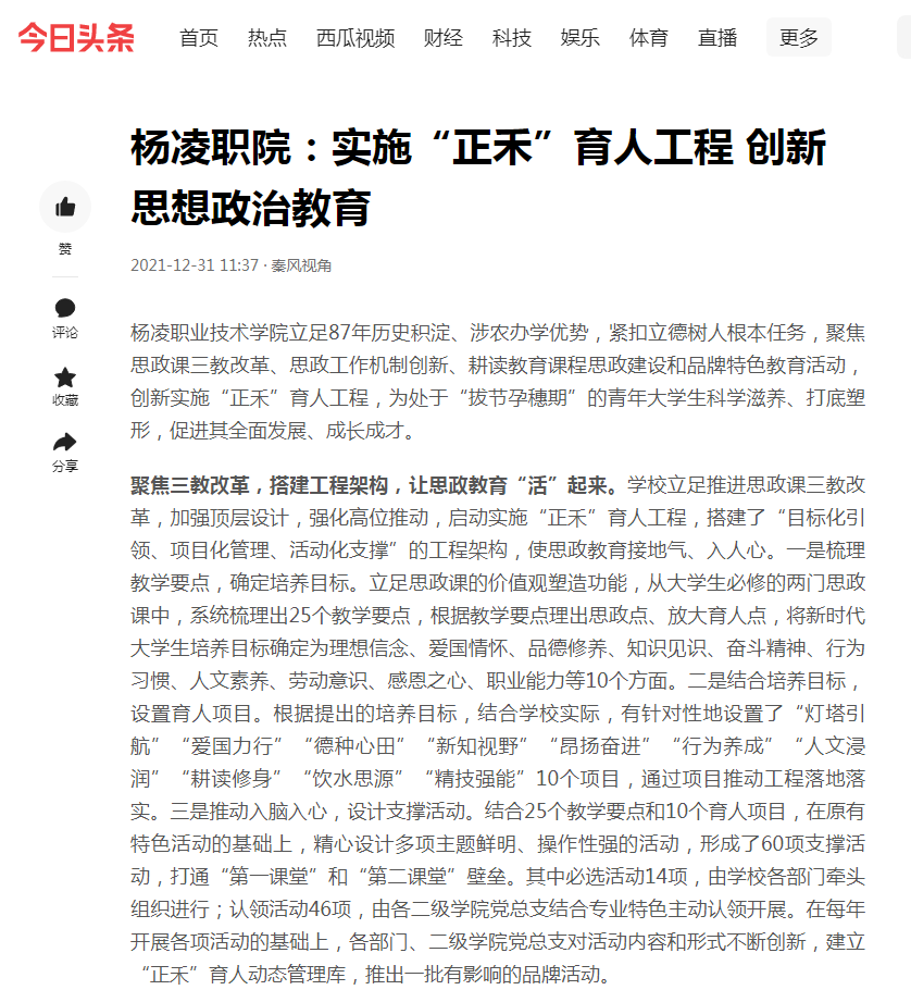 杨凌职业技术学院立足87年历史积淀、涉农办学优势,紧扣立德树人根本任务,聚焦思政课三教改革、思政工作机制创新、耕读教育课程思政建设和品牌特色教育活动,创新实施“正禾”育人工程,为处于“拔节孕穗期”的青年大学生科学滋养、打底塑形,促进其全面发展、成长成才。