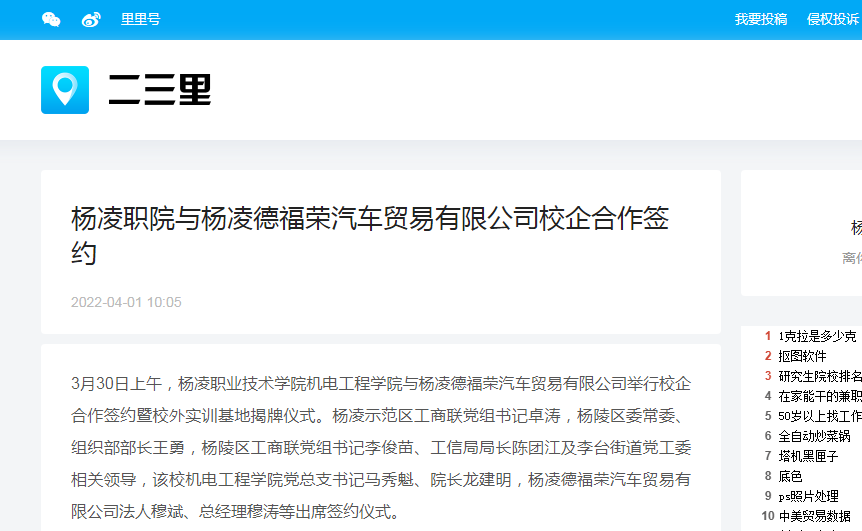 德福荣汽车贸易有限公司是杨凌汽贸企业的龙头企业,与该企业开展校企合作,是学校积极响应国家职业教育发展战略和进一步推进区校融合的重要举措。根据协议,双方将充分发挥各自优势,围绕校企共建4S店、人才培养、师资和员工培训以及教学资源共享等进一步加强合作,促进校企双方共赢,为服务地区经济社会发展作出更多贡献。(文 陆健)