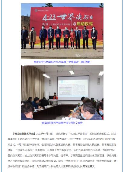 【杨凌职业技术学院】2022年4月18日,该院举行了“4.23世界读书日”系列活动启动仪式,对世界读书日十项活动进行了安排,对2021年度“优秀读者”进行了表彰。此次系列活动分线上和线下两种方式,4月18日至30日举行,包括阅读文化创意设计大赛、数字资源检索达人挑战赛、数字资源系列讲座、“你读书 我买单”图书展销、开通线上图书推荐平台、知名作家读书创作交流会、宣传图书馆各类数字资源、线上数字资源竞赛等十余项内容。近年来,学院高度重视校园文化氛围营造,积极构建全方位耕读教育体系,深化立德树人根本使命。此次“世界读书日”系列活动也是“推进全民阅读,建设书香校园”的重要举措,对于提高广大师生的人文素养和综合能力具有深远意义。
