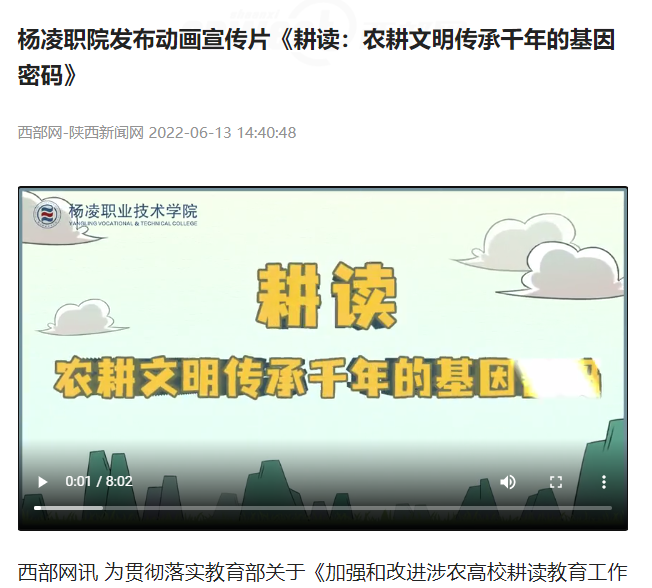 【陕西头条】杨凌职院发布动画宣传片《耕读:农耕文明传承千年的基因密码》