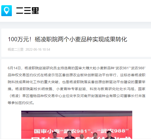 6月14日,杨凌职院赵瑜研究员主持选育的国审大穗大粒小麦新品种“武农981”“武农988”品种权交易签约仪式在杨凌示范区秦创原农业板块创新驱动平台举行,这标志着杨凌职院科技成果转化工作的重大突破,也是杨凌职院落实秦创原创新驱动平台建设的重要举措。