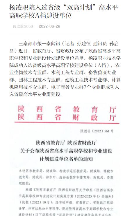 三秦都市报—秦闻讯(记者 孙建恒 通讯员 孙启昌)近日,省教育厅、省财政厅公布了陕西省高水平高职学校和专业建设计划建设单位名单,杨凌职业技术学院成功入选省级高水平高职学校建设单位(A档),农业生物技术专业群、水利工程专业群、畜牧兽医专业群、园林工程技术专业群、建筑工程技术专业群、计算机应用技术专业群、电子商务专业群7个专业群成功入选省级高水平专业群建设。