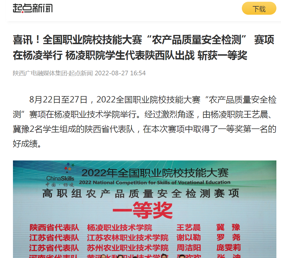 8月22日至27日,2022全国职业院校技能大赛“农产品质量安全检测”赛项在杨凌职业技术学院举行。经过激烈角逐,由杨凌职院王艺晨、冀豫2名学生组成的陕西省代表队,在本次赛项中取得了一等奖第一名的好成绩。