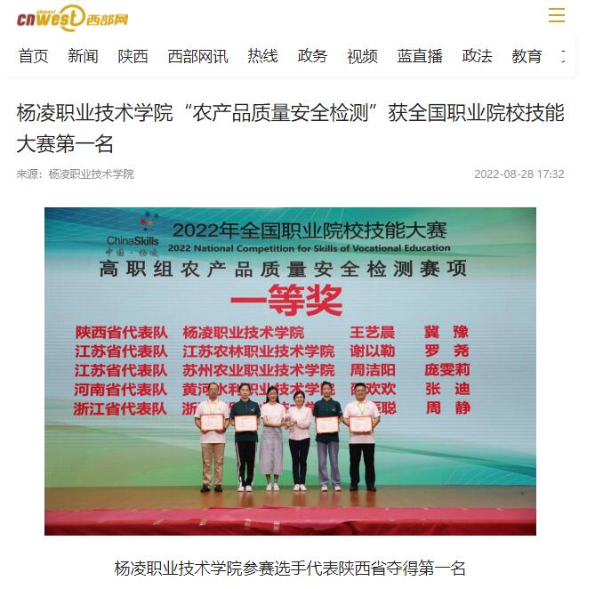 【西部网】杨凌职业技术学院“农产品质量安全检测”获全国职业院校技能大赛第一名
